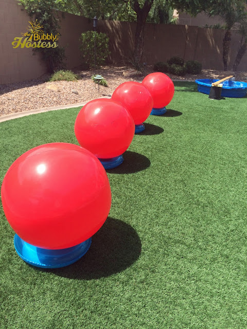 Once on the other side of the yard, they had to cross over a baby pool while being sprayed with water guns and last but not least, leapfrog over the "big red balls" - these awesome 36" red beach balls were the perfect find for me from Beachballs.com.