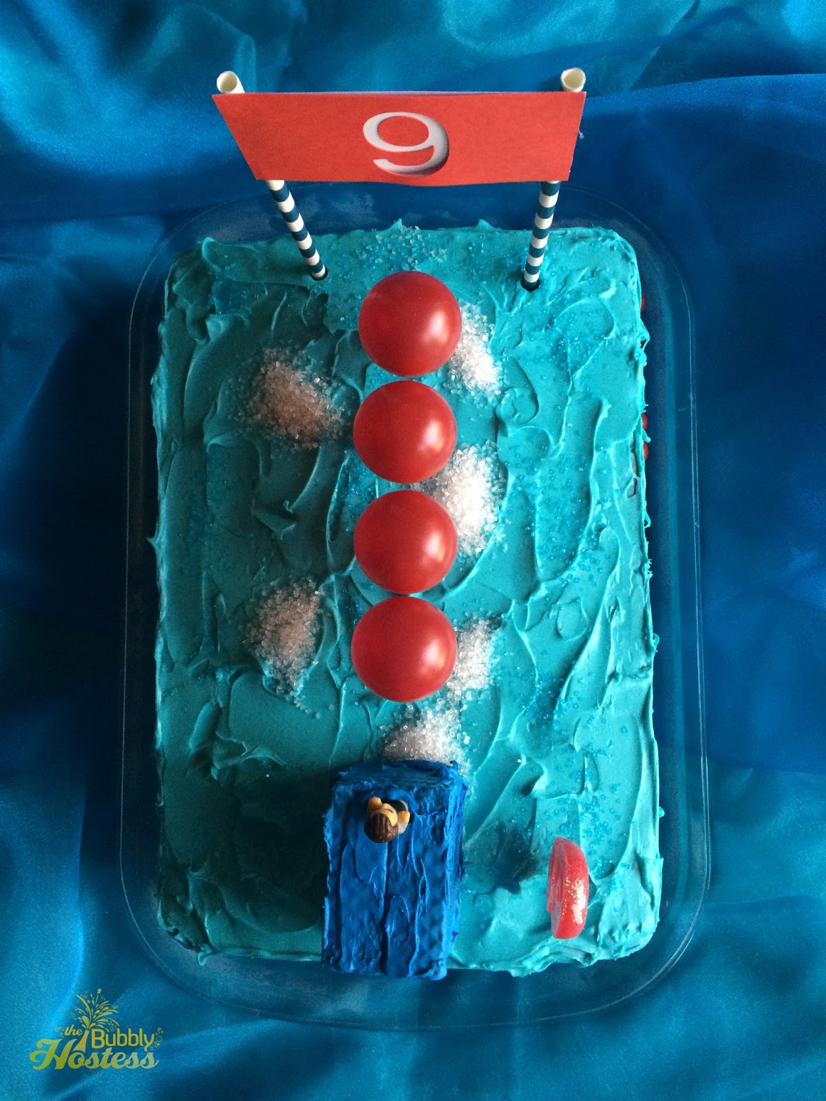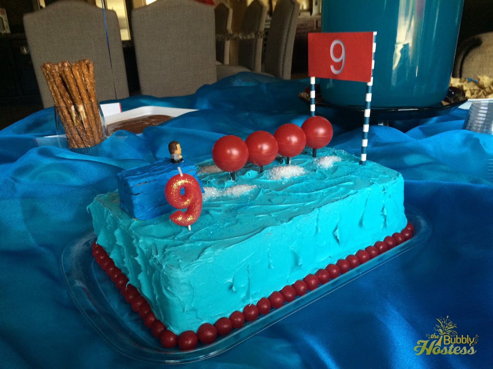 We used red ping pong balls that were glued to straws, vanilla creme wafers covered with leftover frosting that I tinted a darker blue made the platform, and Crafted by Kiki made the "finish line" #9 sign for me. All designed by my son. He even added the piles of white sprinkles to reflect the mounds of bubbles you see in the Wipeout Water on the show!